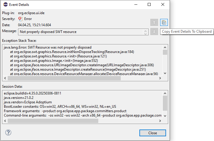 Note in particular that this gives you information about the GitHub or GitLab oganization and even the repository of that organization, e.g., https://github.com/eclipse-platform/eclipse.platform.swt. Keep in mind that problems are often caused by misuse of the framework farther down in the stack. Also, stack traces are often long chains of exceptions where typically the final exception (cause) is the most signfiicant. In this specific case, SWT provides support for tracking cases where other software is not properly disposing resources, leaking handles which will eventually force the application to require a restart.