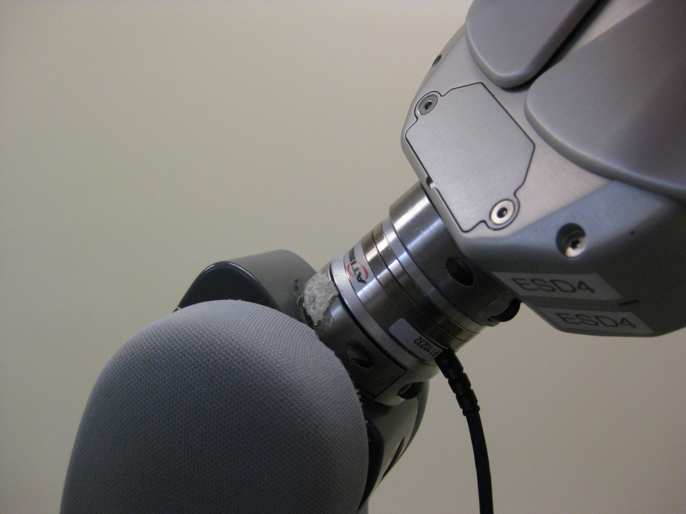 Currently, the sensor cable is routed externally between the wrist and NetFT box mounted on the shoulder, although there are plans for routing the cable into the gripper to a custom PCB and through the slip ring to avoid wrapping up the cable. However, while the ATI Mini40 is very similar in O.D. to the gripper/forearm interface, the I.D. is too small to allow the JST connector to pass from the forearm to the gripper. As a result, anytime the sensor needs to be replaced, the connector would have to be removed and reconnected, resulting in a potential point of failure. We are investigating alternate sensors with larger I.D.s.